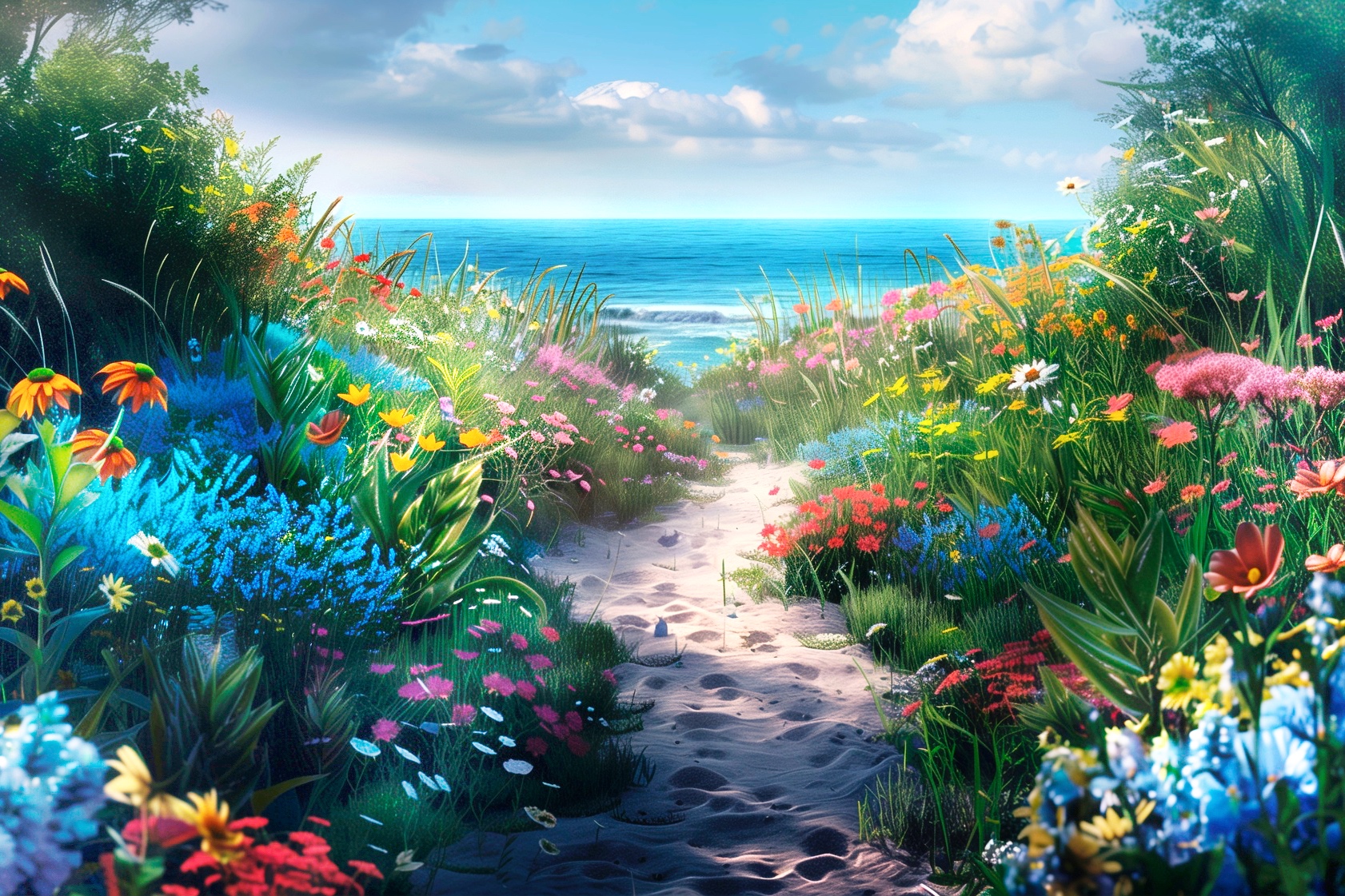 Langs het pad groeien bloemen in roze, geel, rood, blauw en wit. De speelse bloemblaadjes en sierlijke grassen bewegen bijna voelbaar in de zeebries. Het zonlicht dat over het pad en de planten valt, geeft het ontwerp een warme en optimistische uitstraling. Dit tafereel straalt vrijheid, rust en natuurbeleving uit – perfect voor liefhebbers van strand, bloemen en landschappen.