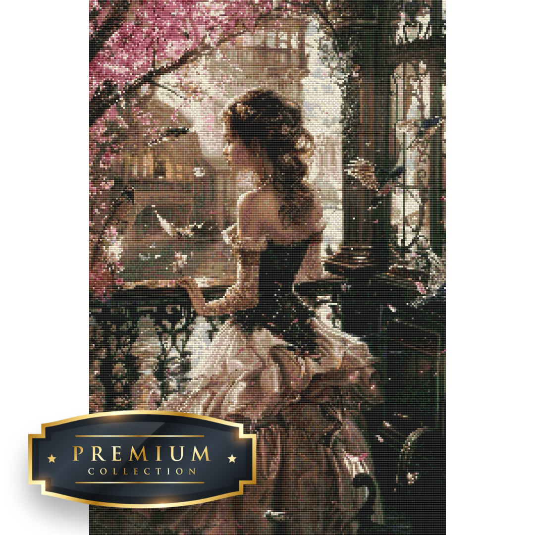 Dame kijkend vanaf het balkon Premium DP Diamond Painting in het formaat 50×75 centimeter met 50 kleuren.
