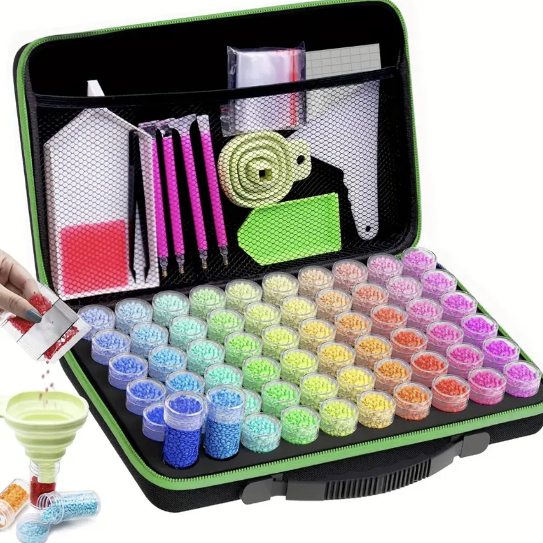 In deze opbergkoffer zitten 60 potjes met schroefdop om makkelijk te openen en af te sluiten. Goed voor circa 1200 steentjes. Ook is deze gevuld met een groot aantal Diamond Painting accessoires.