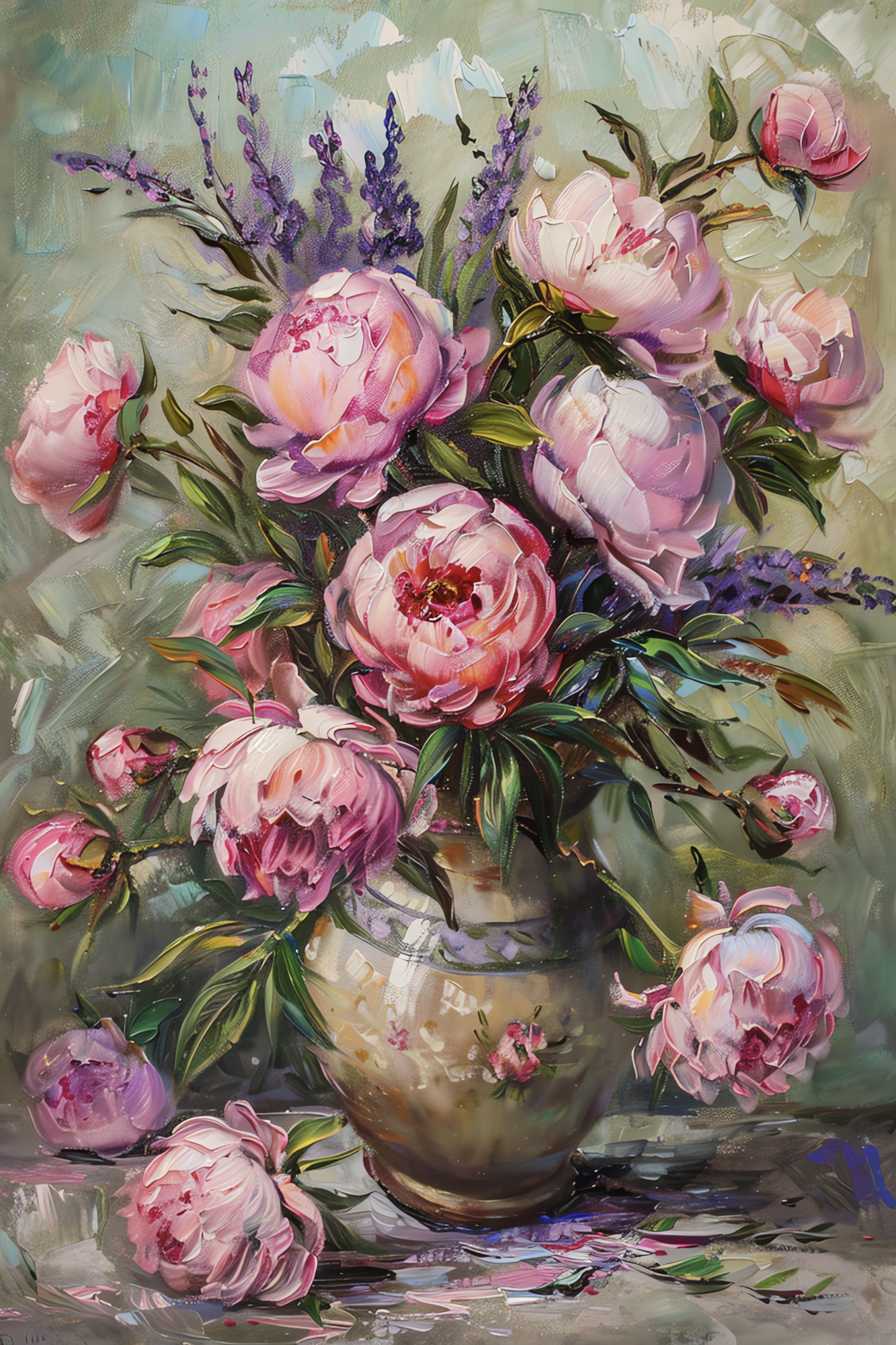 Laat je betoveren door kleur, elegantie en romantiek met de Vaas met pioenen Diamond Painting! Deze sfeervolle afbeelding toont een rijk gevulde vaas met grote, bloeiende pioenrozen in tinten roze, wit en lila. De bloemen lijken bijna van het doek te springen dankzij de levendige penseelstreken en diepe kleurcontrasten. De verfijnde achtergrond in zachte pasteltinten zorgt voor een subtiele balans, waardoor de bloemen alle aandacht krijgen.